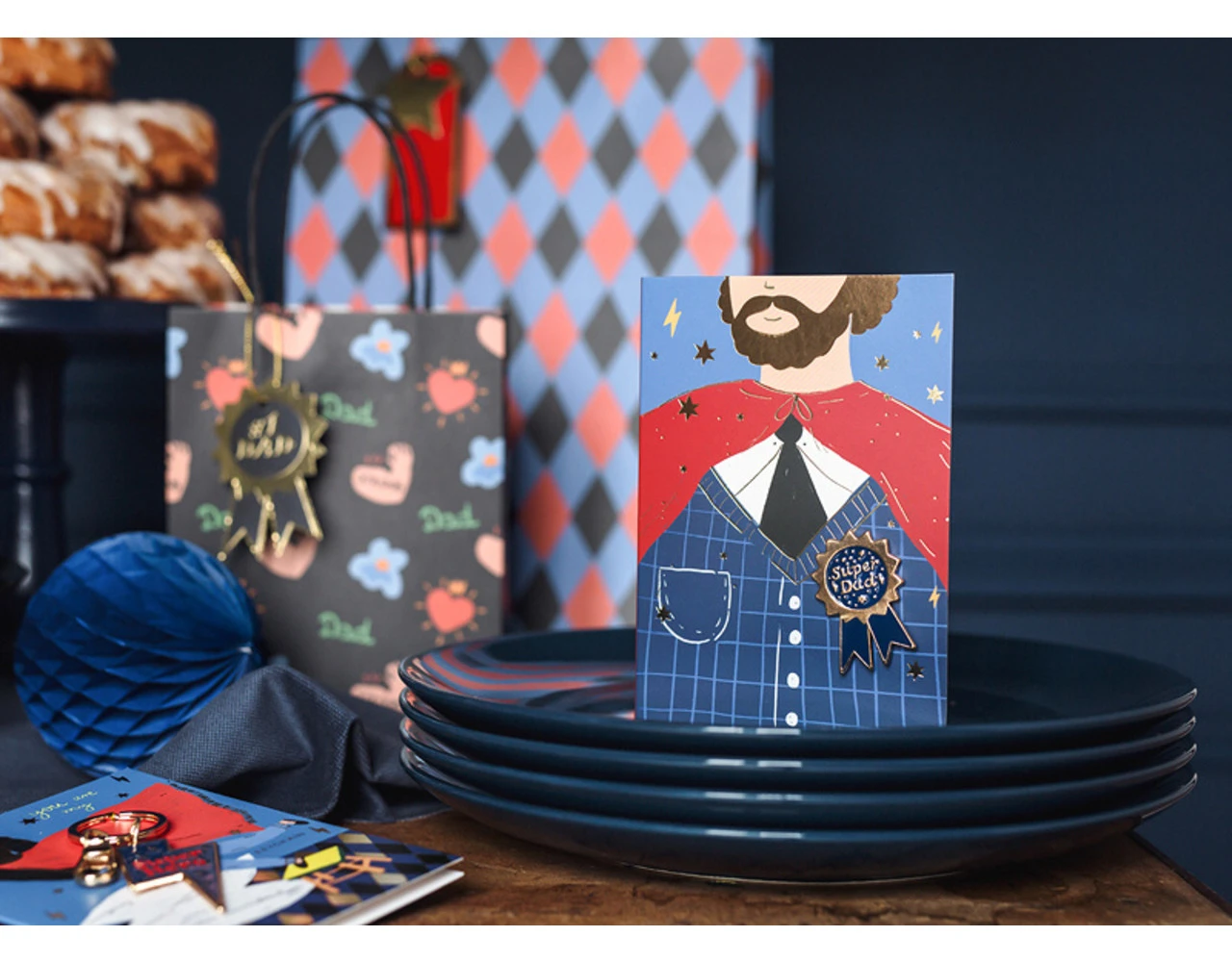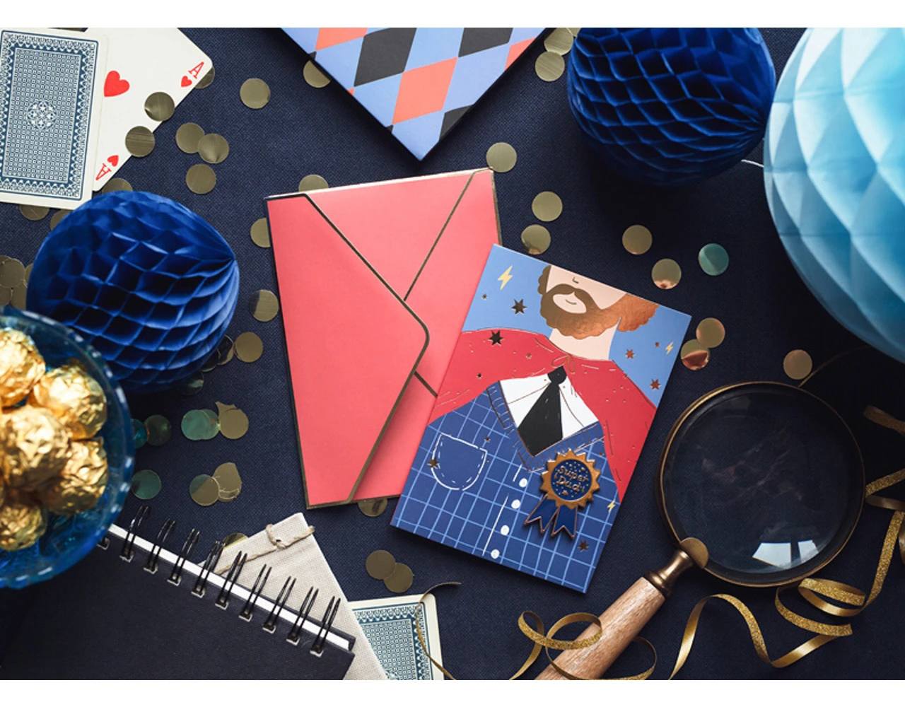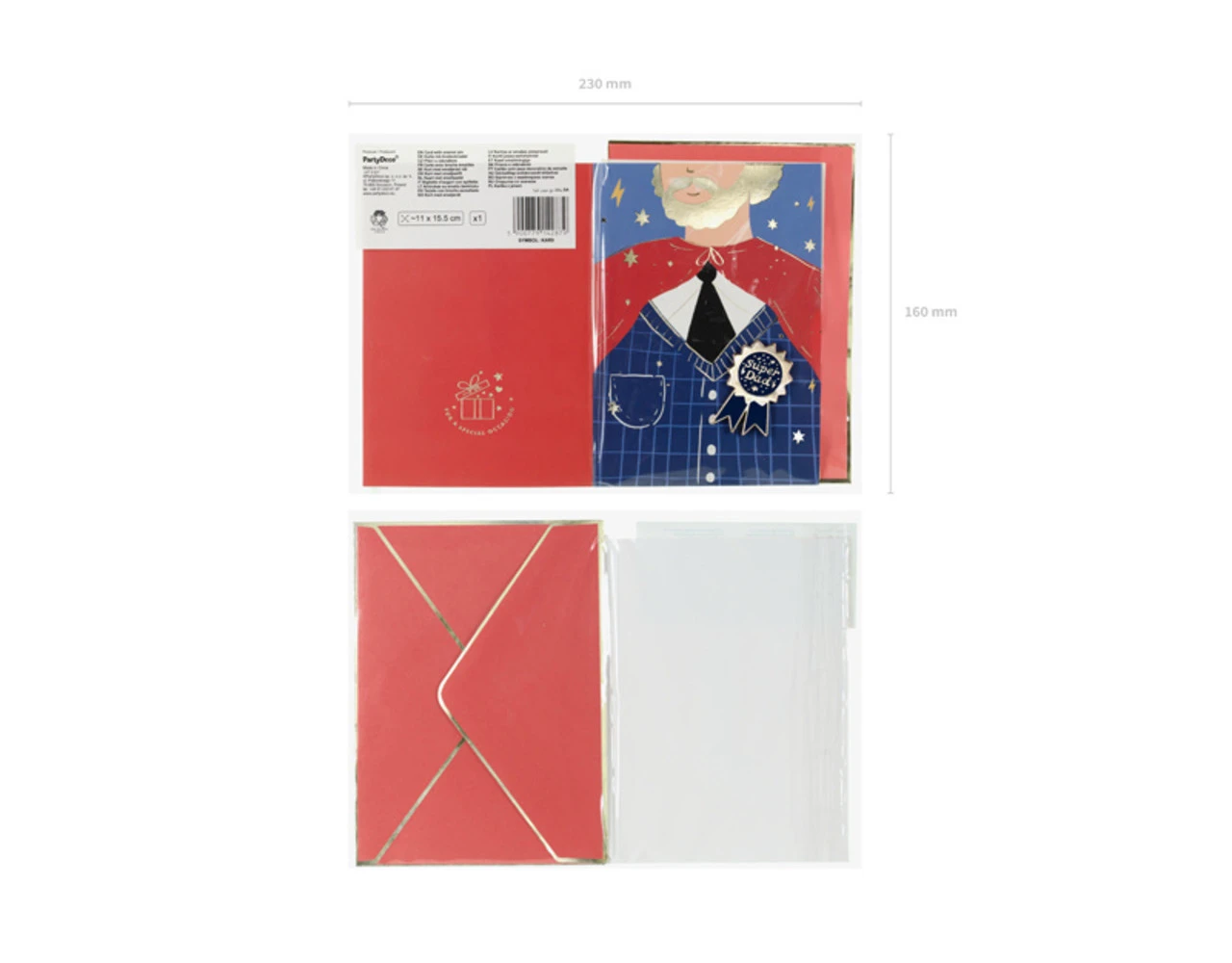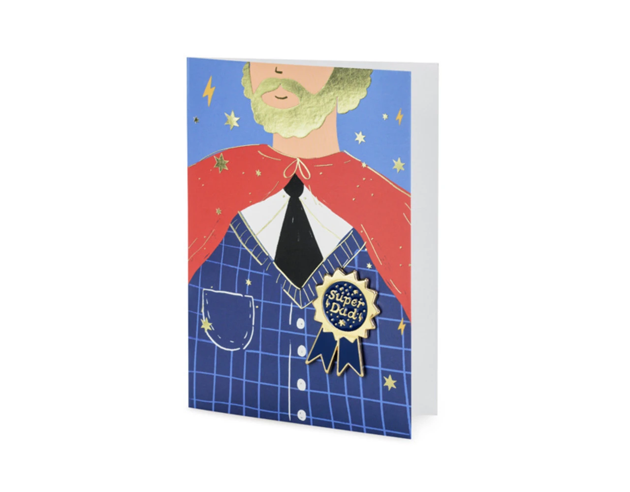 Kaartmix van kleuren met goud-metallic opdruk met emailspeld in de vorm van cotillion met opschrift Super Dad en rode envelop met goud-metallic opdruk, formaat cad ca. 11 x 15,5 cm, formaat emailspeld ca. 3 x 4,5 cm.