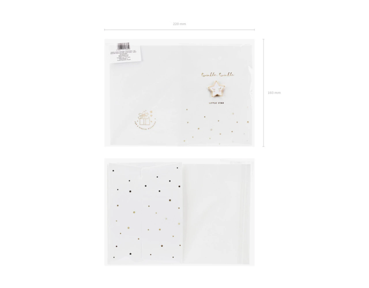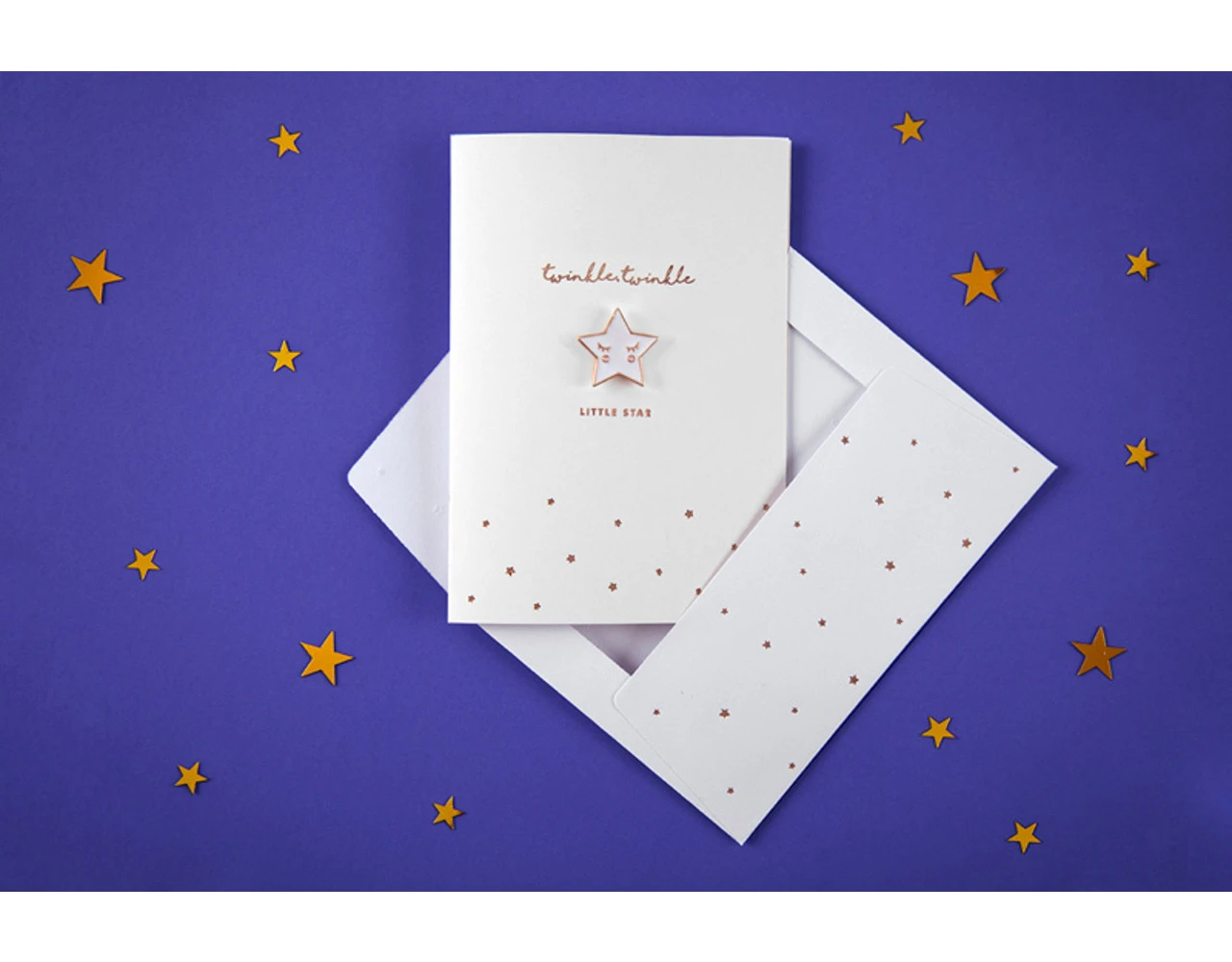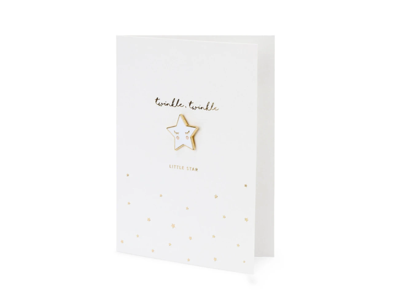 Kaart in witte kleur met goud-metallic opdruk met ge‘mailleerde speld in de vorm van een ster en witte envelop met goud-metallic opdruk, formaat kaart ca. 10,5 x 14,8 cm, formaat ge‘mailleerde speld ca. 2,5 x 2,5 cm.