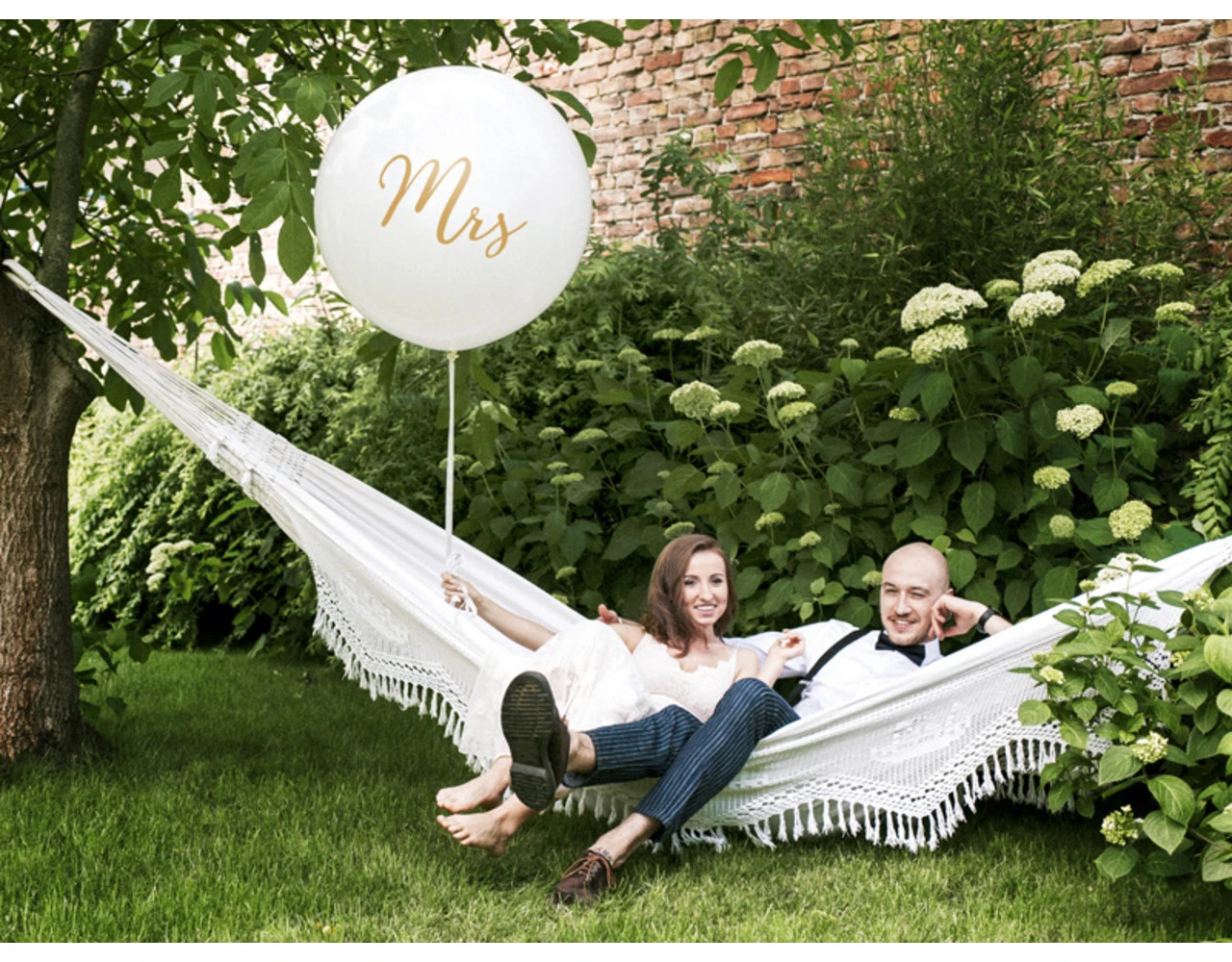 Reuze ballon, diameter ca. 1 meter, pastel wit met goud opdruk Mevrouw, het ventiel bevindt zich aan de onderzijde, voor het opblazen is 0,4 m3 helium nodig.