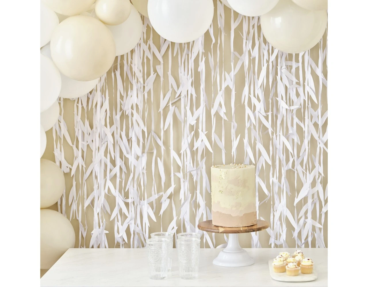 Creëer een verbluffend statement op uw feest met deze White Leaf Ribbon-achtergrond. Het subtiele ontwerp is perfect voor elke gelegenheid.