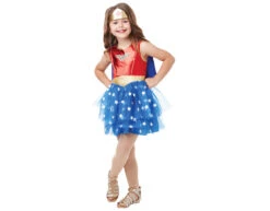 Wonder Woman is prinses Diana van Themyscira, maar ze neemt in het dagelijks leven de burgeridentiteit van Diana Prince aan. De DC-superheldin uit de Amazone-jungle, ze heeft bovenmenselijke kracht en snelheid en gebruikt betrouwbare wapens zoals haar lasso van de waarheid, haar tiara en kogelvrije armbanden. Ze werkt samen met medehelden als Batman en Superman als onderdeel van de Justice League en pakt de misdaad aan waar die ook op de loer ligt. Wonder Woman, afgeschilderd als sterk, sexy en slim is verschenen in veel Warner Bros-films, tekenfilms, tv-series en videogames. Ze is ook een teamlid van de DC Superhero Girls naast Batgirl, Supergirl en Harley Quinn. Van de dagen van Lynda Carter op het kleine scherm tot Gal Gadot op het grote scherm in Batman Vs Superman: Dawn of Justice (2016), Wonder Woman (2017) en Justice League (2017). Inclusief jurk met metallic lijfje, gevormd gouden logo op de borst digitaal gedrukt in gouden rand Rok van jurk heeft een satijnen onderlaag en tule overlay met witte sterren plus gevormde gouden riem bevestigd aan jurk Cape is satijn met afneembare klittenbandsluitingen op schouders Metallic stof tiara hoofddeksel met elastische band om vast te maken. Schoenen niet inbegrepen.