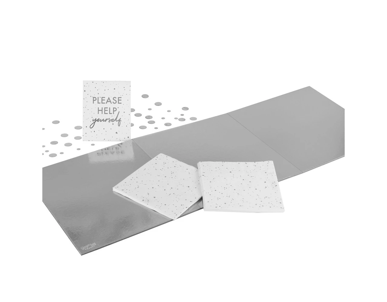 1 gouden graasplank van 80cm (L) x 30cm (B), 20 servetten, 14g zilveren confetti en 1 kaartje. De verpakking is recyclebaar en FSC-gecertificeerd.