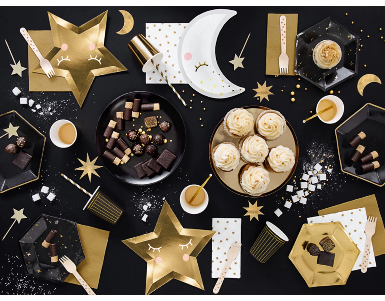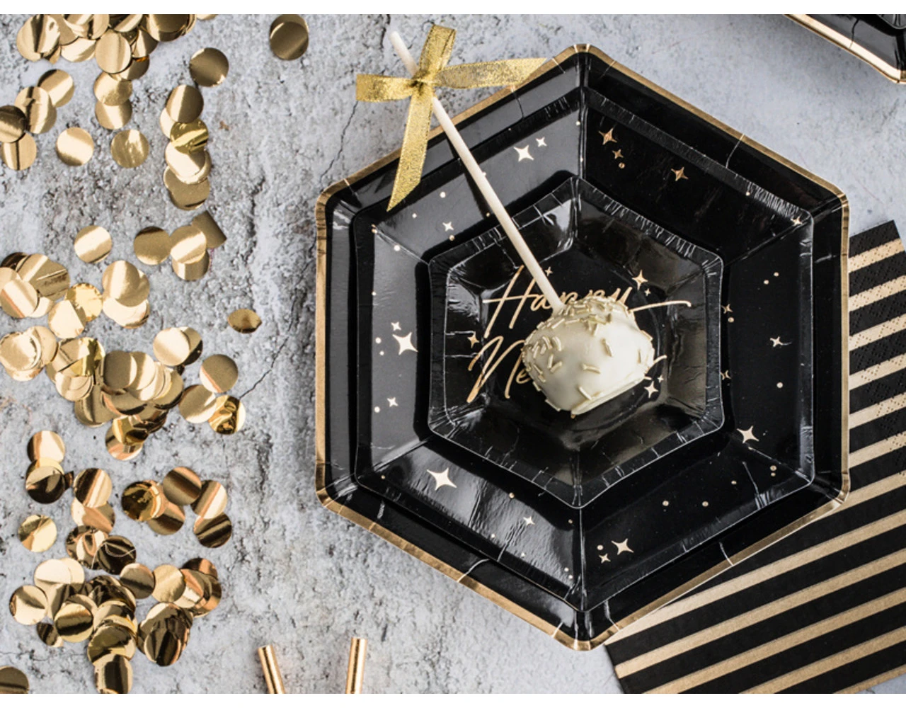 Papieren bordjes Let’s Celebrate in zwarte kleur met gouden randjes, diameter ca. 23 cm.