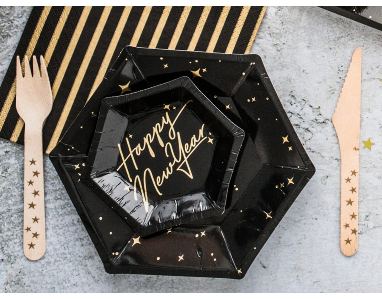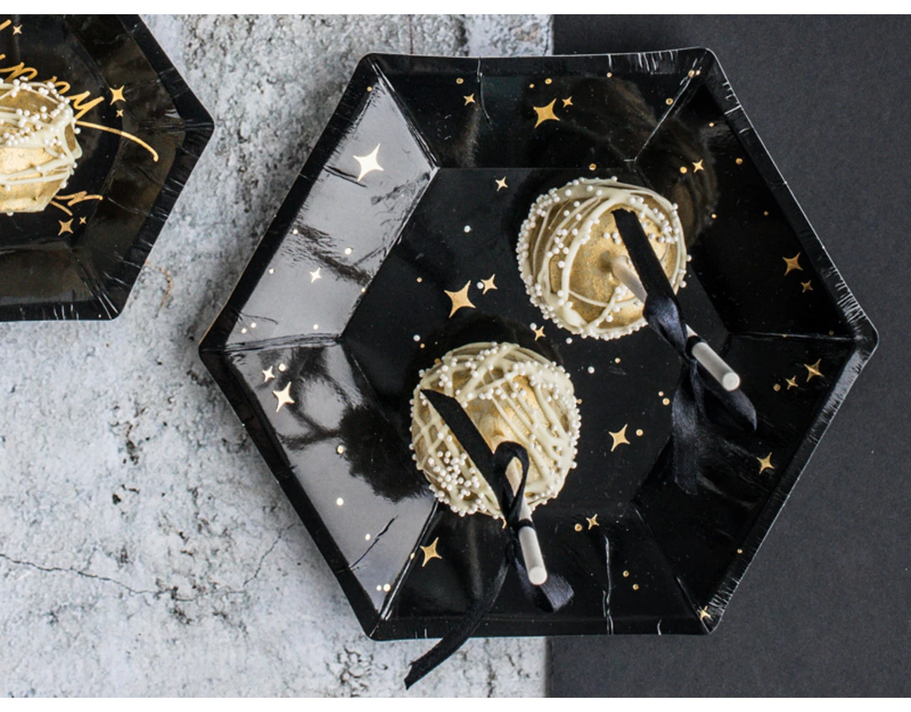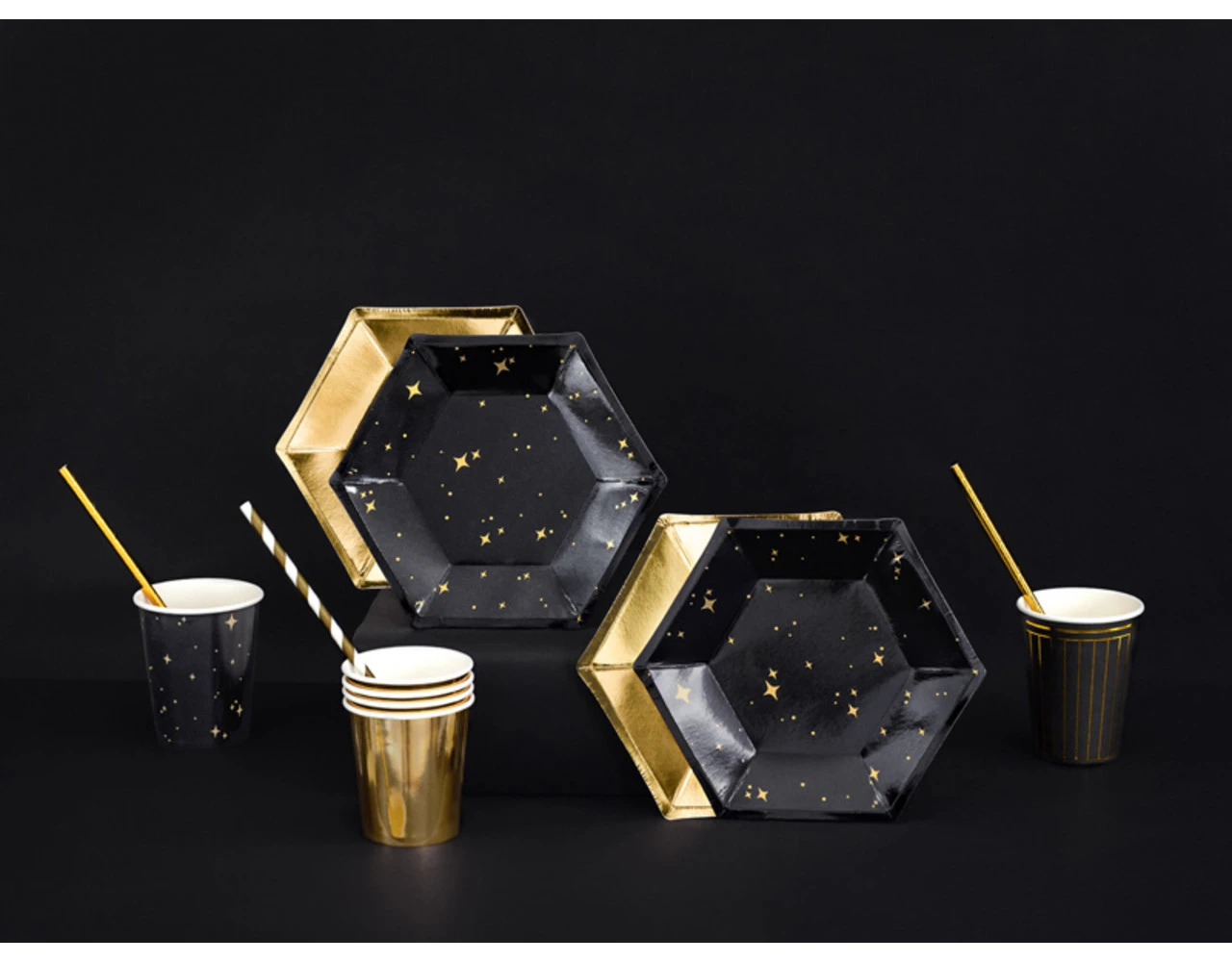 Papieren bordjes Let’s Celebrate in zwarte kleur met goudpatroon, doorsnede ca. 20 cm.